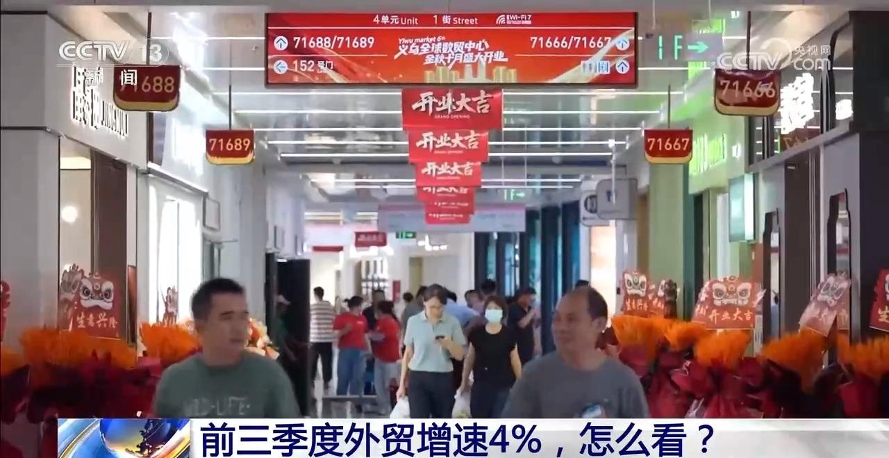 央视网消息:10月13日,海关总署公布了我国前三季度的外贸的成绩单,整个前三季度我国货物贸易进出口达到33.61万亿元人民币,同比增长了4%。其中第三季度同比增长达到了6%,尤其是9月份,同比增长了8%。在当前的这种外部环境和压力之下,这份外贸成绩单来之不易。我们的外贸为什么能够保持这样一个稳定增长?第四季度我们又如何进一步拓展外贸的新空间呢?《新闻1+1》关注:前三季度外贸增速4%,怎么看?