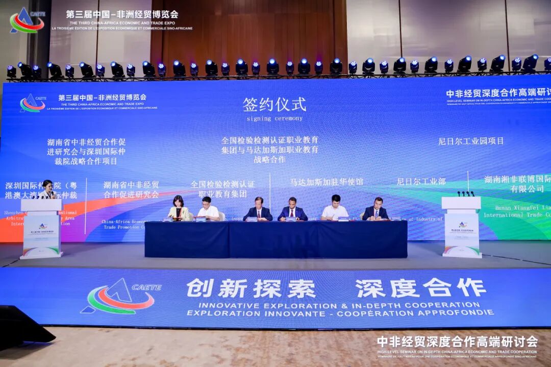 在授牌及项目签约仪式环节,中央财经大学向湖南省中非经贸合作促进研究会授予《国际财税协会(中国)中非经贸实训基地》,中央财经大学财经研究院向研究会财税评议中心授予《中非财经研究智库中心》。之后举行了中非联合仲裁中心战略合作项目、西非黄金数字电视台战略合作协议等项目的集中签约。